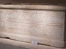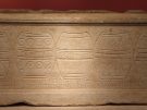 An imaginary version of what the sarcophagus may have looked like in colour (the evidence is not sufficiently clear to properly reconstruct the colour scheme, except for the central inscribed bands having been red).