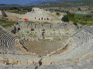A view of the (restored) bouleuterion or council chamber at Patara, as seen from the theatre, with the findspot of the sarcophagus marked in red.