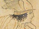 The belly of the amphora shows two groups of warriors approaching one another, with archers on the left, slingers on the right and a dead or fallen body in the middle. It's crude but clear, and the marching warriors already show the features that will define the Greek hoplite, the citizen warrior, a century or more later: shield, helmet and two spears. The artist even paints their shields differently, to give them individuality, or so one assumes. Maybe his drawing meant to depict people he knew.