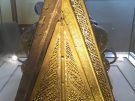 What exactly do you see? A tent-shaped wooden container (the wood is yew), about the size of a small suitcase in modern terms (it's 48cm or 19" tall), all four visible sides of it adorned with metal decorations, cast in bronze, gilded, incised and attached to the wood with nails or dowels. There must once have been more of these metal adornments, as indicated by the obviously incomplete compositions and the many holes in the wood.