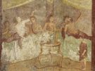 Fresco panel showing a dinner party with painted messages: FACITE VOBIS SUAVITER EGO CANTO and EST ITA VALEAS (make yourselves comfortable; I am singing; go for it!); AD 40–79, Pompeii, House of the Triclinium. Museo Archeologico Nazionale di Napoli.