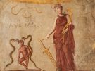 Fresco wall panel showing Isis Fortuna protecting a man flanked by the agathodaemones (protective serpents), with painted message: CACATOR CAVE MALU[m] (‘crapper beware the evil [eye]’); AD 40–79, Pompeii, Museo Archeologico Nazionale di Napoli.
