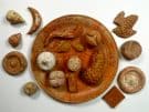 Terracotta votive food: pomegranates (open and closed), grapes, figs, almonds, cheeses, focaccia, honeycomb, mold, long bread, 360 BC, Tomb 11, Contrada Vecchia. Agropoli Parco Archeologico Di Paestum.