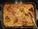 6. Transfer the entire meat mix to an oven-proof dish (clay/earthenware or pyrex). Add the pasta and the remaining oil and red wine, and mix everything very well. Make sure that the chunks of meat sit on the bottom of the dish and are well-surrounded with pasta and liquid, and also that the pasta is infused with liquid (the noodles have a habit of sticking together in lumps, so break them up and spread them among the chunks of meat). Then, sprinkle the cheese on top and stir once more, very lightly (this is not to be a dish with a cheese crust, so you don't want the cheese sitting on top, but neither do you want it stirred evenly throughout the contents: it should be mixed just into the top layers of the pasta).