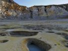 The first is how the island is entirely and totally dominated and determined by its volcanic origins. From the island's outline to its topography, from natural landforms via traditional building materials to the composition of beach sand, from colours to scents, the volcanic history of Nisyros is omnipresent. At every step and every viewpoint, it comes to mind, be it in the form of the smooth “bubbles” in the cliff of an old magma-flow, of the jagged cubes of broken lava, of the looming presence of multiple long-dormant craters, or of the vast amounts of pumice, volcanic ashes that have fallen on the island and on its neighbours, tiny Giali and much larger Kos, during so many eruptions.