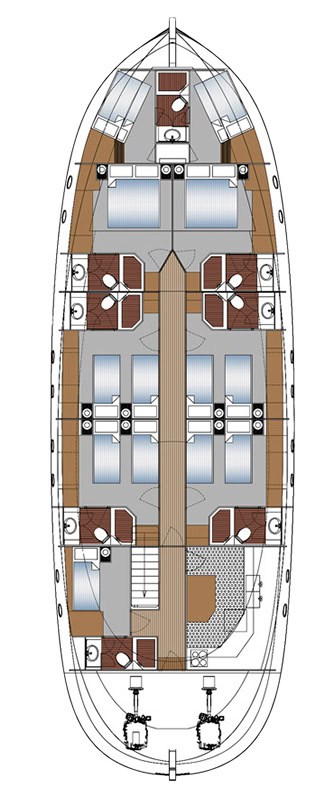 Green Ray is a fabulous boat, a motor sailing yacht, built along the traditional lines of a traditional 15th century Dalmatian merchant vessel – a unique combination of traditional local ship design and modern shipbuilding techniques. She has an elegant exterior and interior design and is fitted out with all modern conveniences. She has flexible accommodation in 2 double and 4 convertible twin/double cabins. All cabins are spacious, well appointed and en suite. She has a lovely bright saloon, and a large deck with plenty of space for sunbathing, relaxing and watching the Croatian coast go by.