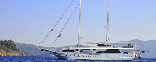 One of the gulets we use most frequently for our scheduled tours and one that we have been working with for well over a decade. At 34 metres (110ft) she is impressively large, with an enormous flybridge, offering a great deal of deck space to relax in comfort, while also retaining the elegant lines and character of a traditional gulet. The Kayhan II has 6 double cabins and 4 twin cabins, all en-suite and equipped with modern conveniences like air conditioning and hair dryers.